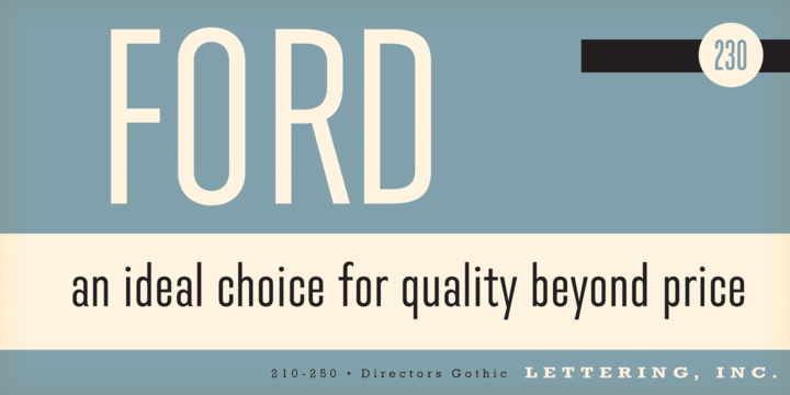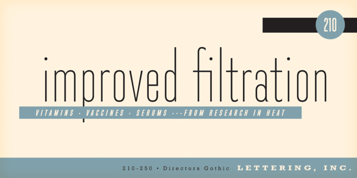 Directors Gothic was painstakingly developed from the original font glass masters from the 1930s and includes a full international character compliment, automatic fractionals, ordinals, and an impressively large assortment of alternate characters in dynamic OpenType format.